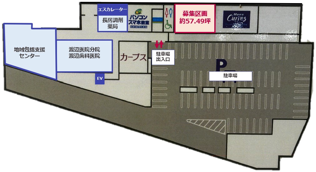 物件です。194台の駐車場が完備されており、車のアクセスも便利です。同フロアには内科と歯科が開院しており、既に医療が組成されているため、